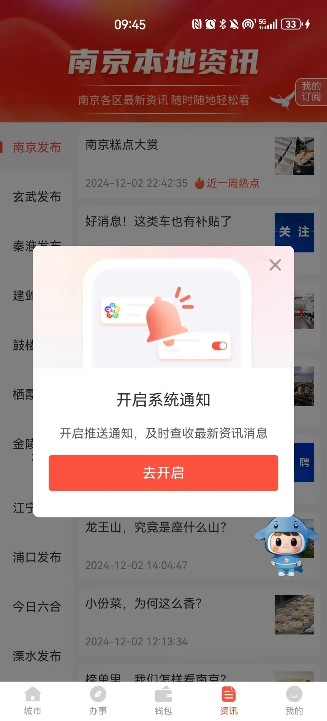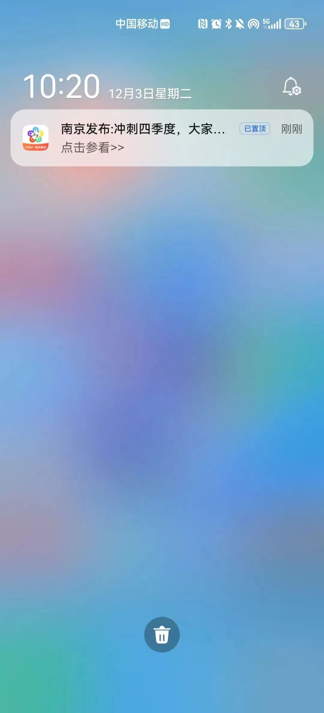 4、訂閱成功后,當(dāng)已訂閱的微信公眾號資訊內(nèi)容有更新時,用戶即可通過“我的南京”APP收到本地資訊平臺推送的消息。