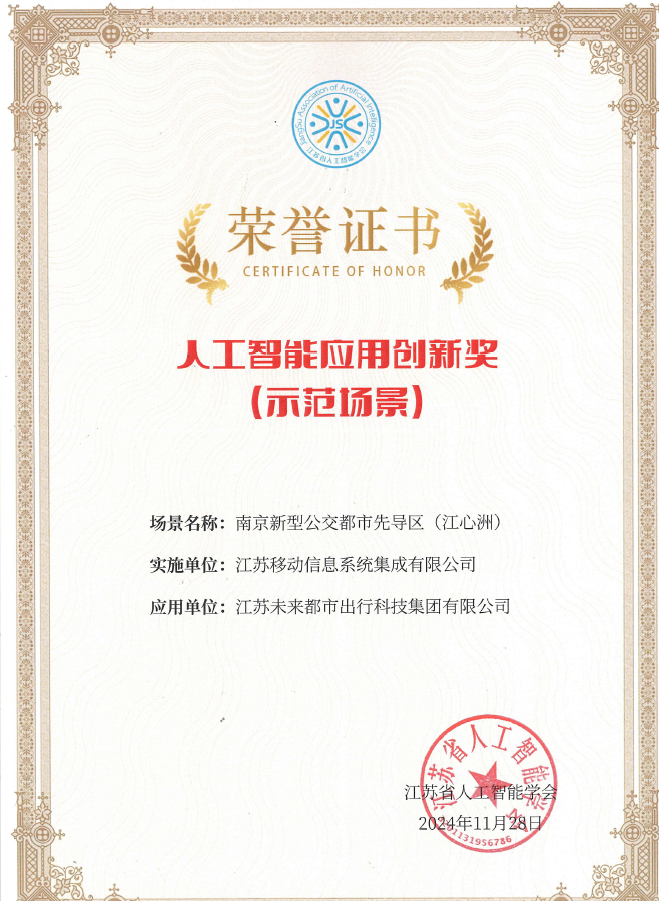 近日,江蘇省人工智能學(xué)會組織專家評審,對2024年度江蘇省人工智能學(xué)會科技成果獎授獎項(xiàng)目名單進(jìn)行公示,由江蘇未來都市出行科技集團(tuán)打造的“新型公交都市先導(dǎo)區(qū)(江心洲)” 項(xiàng)目入圍人工智能應(yīng)用創(chuàng)新獎(示范場景)名單。這是繼去年獲獎后,出行公司再次獲得該項(xiàng)榮譽(yù)。