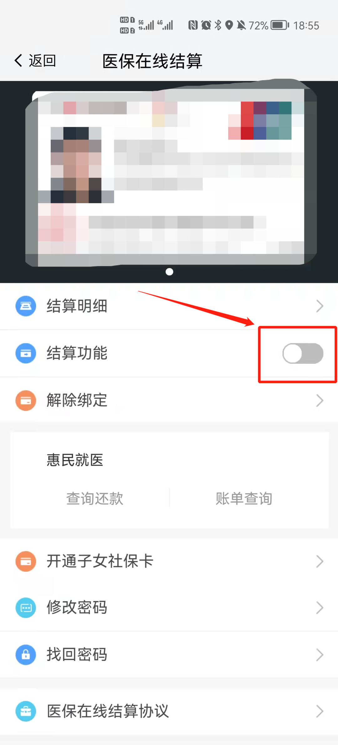 第四步:進(jìn)入醫(yī)保在線結(jié)算,選擇結(jié)算功能右側(cè)的按鈕開啟。